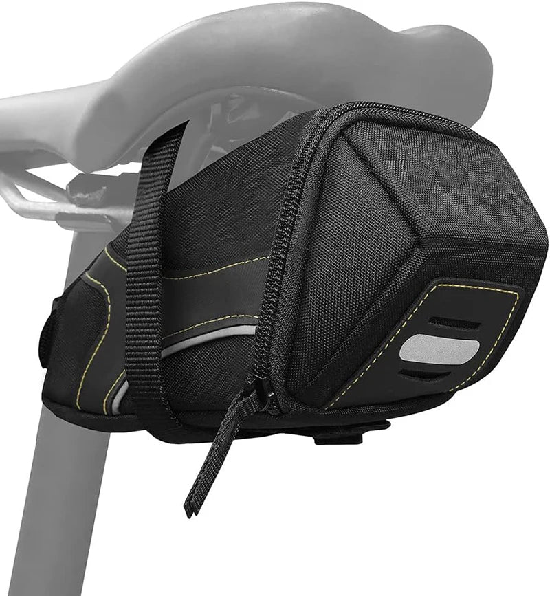 Pros: Inexpensive, good size, well made and designed, reflective material on the rear with a cutout for a reflector. Contoured opening helps fit slightly larger items than a flat one would. Velcro strap for seat post is adequate. Hard plastic insert protects items inside from the seat rails above.